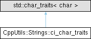 A character traits structure allowing for case-insensitive string comparisons. Overloads the functions it needs and inherits the rest from std::char_traits<char>.